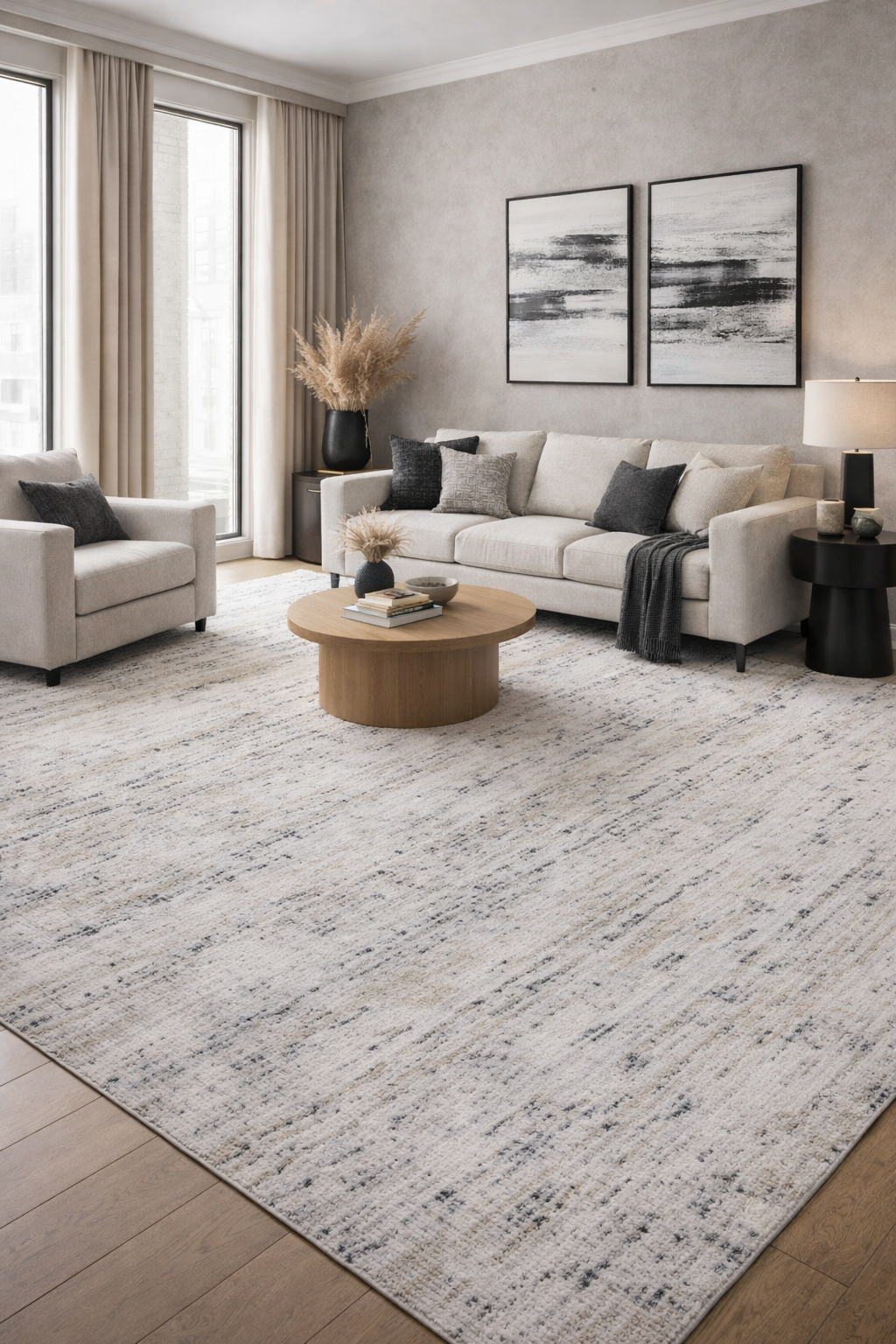 O Tapete Essence 20 da Via Star traz um design moderno e minimalista, com padronagem abstrata em linhas suaves e textura visual discreta. Sua base em tons claros de bege e off-white, combinada com detalhes em cinza e nuances mais escuras, cria um ambiente elegante, leve e sofisticado.